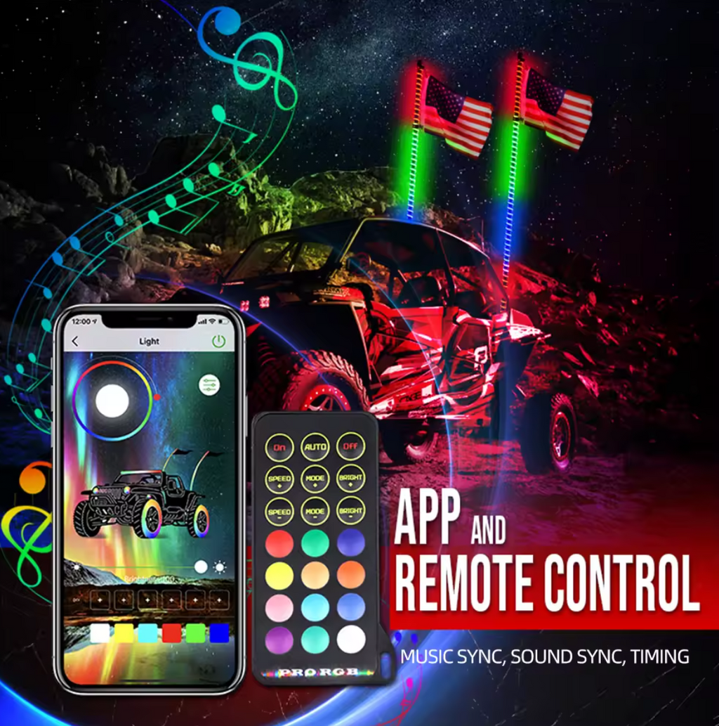 Newest APP Remote Control 2ft 3ft 4ft 5ft 6ft COB RGB Color Offroad Car UTV ATV Led Whips Light